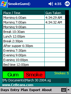 This program can be used when you use nicotene gum to quit smoking. Plan the times when you will use your gum. If you smoke then tap the 'smoke' button to log it.
