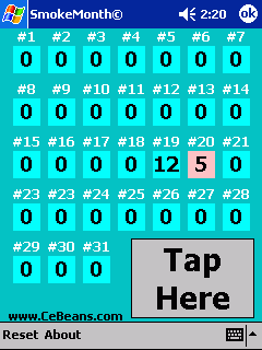 This program can be used to help you to quit smoking. Each time you smoke tap the button. Each day try to smoke 1 less then the previous day.