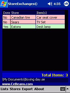 This program allows you to enter a list of the items that you have to exchange at stores. Once done select 'done'. You can also export the list into Pocket Word.
