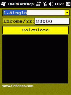 This program calculates your income taxes and reports to a SMTP Email report with a single click. Select your marital status and enter your yearly income to do the caculation. The program determines your tax bracket and sets the income tax percentage. This is based on previous year rates. NOTE: This program is just an estimate from prior tax rates.