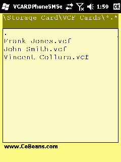 This program is a folder based VCARD (VCF) composer and viewer that allows you to send SMSes to the contacts. Select the storage card folder of your PocketPC and select 'Create New' from the toolbar. The program will allow you to compose a VCARD profile and when you tap the 'Save' button save the information to the VCF file format.