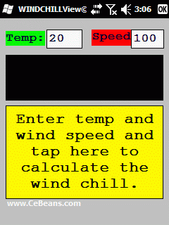 This program allows you to enter a temperature and wind speed and when you tap the button calculates the windchill. Simply enter the values and tap the button to find the wind chill readings.