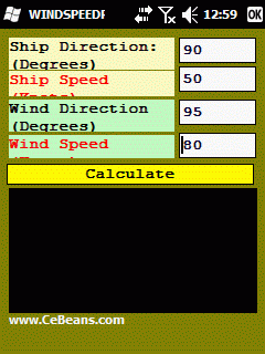 This program calculates the wind speed on a ship or object using relative wind speed. Enter the wind speed and wind direction and the ship speed and ship direction. When you tap the button the program will display a report of the relative wind speed and direction based on inputs and creates a SMTP email report.