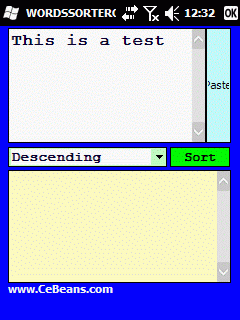 This program takes a list of words seperated by spaces that you enter or paste and sorts the list of words into ascending or descending order and allows you to copy the result to the PocketPC clipboard. Simply enter or paste the words list and select if you want them in ascending or descending order and tap the button. You can copy the sorted list to the PocketPC clipboard and paste into any application.
