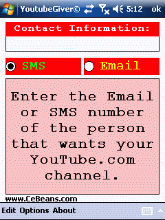 This program allows you to give your YouTube.com channel url to a person via Email or SMS. Enter your YouTube.com channel name and any notes. The information is stored in a file. When someone asks you for your YouTube.com channel enter the Email/SMS number and tap the button to send it via Email or SMS. This service is provided by www.YouTube.com