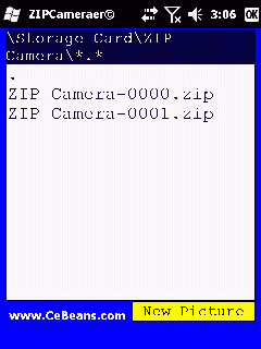 This program is a camera app that ZIPs the images taken in real time. Select a folder on your storage card to store the camera images. Each time you take a picture the program will ZIP the JPEG from the camera into a ZIP and place it into the current folder. You can also tap on a ZIP file to unzip it and view in your picture viewer. The ZIP and UNZIP libs are from 'Info-ZIP (c) 1990-1999'